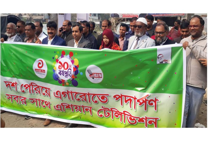 দশ পেরিয়ে এগারোতে পদার্পণ উপলক্ষে টাঙ্গাইলের মির্জাপুরে নানা আয়োজনে এশিয়ান টেলিভিশনের ১০ম বর্ষপূর্তি উদযাপন হয়েছে। আজ বুধবার সকাল ১০টায় মির্জাপুর রিপোর্টার্স ইউনিটির প্রাঙ্গন থেকে একটি র্যালি বের হয়ে শহর প্রদক্ষিন করে পুনরায় রিপোর্টার্স ইউনিটির প্রাঙ্গনে এসে শেষ হয়।