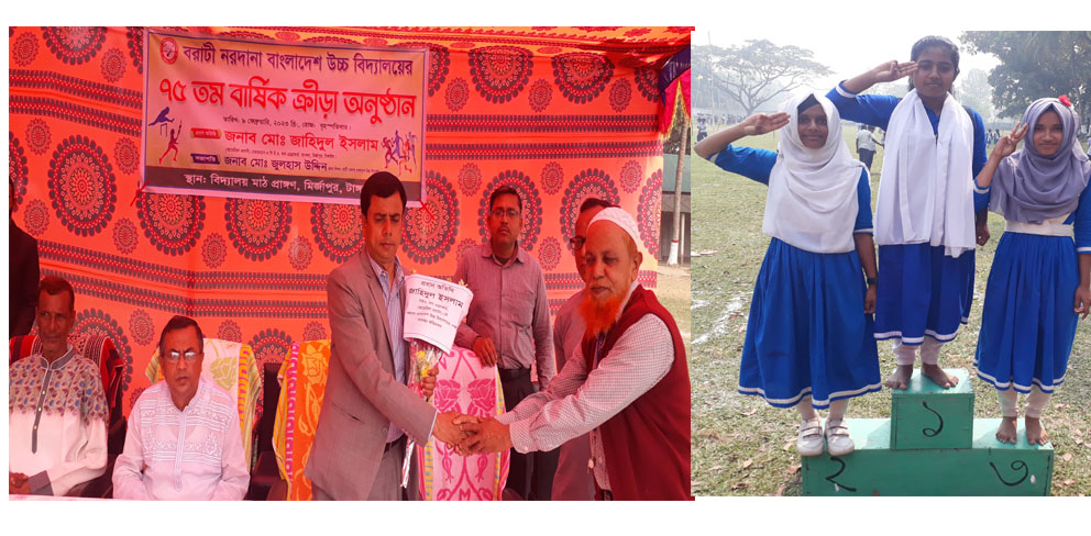 টাঙ্গাইলের মির্জাপুরে ঐতিহ্যবাহী শিক্ষা প্রতিষ্ঠান মির্জাপুর উপজেলার বরাটী নরদানা বাংলাদেশ উচ্চ বিদ্যালয়ের ৭৫ তম বার্ষিক ক্রীড়ানুষ্ঠান উৎসব মুখর পরিবেশে আজ বৃহস্পতিবার (৯ ফেব্রুয়ারী) বিদ্যালয় মাঠ প্রাঙ্গনে অনুষ্ঠিত হয়েছে। বিদ্যালয়ের প্রধান শিক্ষক মো. জুলহাস উদ্দিনের সভাপতিত্বে অনুষ্ঠানে প্রধান অতিথি ছিলেন আমেরিকা প্রবাসি ও খান এগ্রো ফার্মের চেয়ারম্যান এবং সিইও মো. জাহিদুল ইসলাম বাছেদ। সকাল থেকে বিকেল পর্যন্ত বিদ্যালয়ের শিক্ষার্থীরা বিভিন্ন ইভেন্টে অংশ গ্রহন করে। এ সময় বিদ্যালয়ের ম্যানেজিং কমিটির সদস্যবৃন্দ, শিক্ষক-কর্মচারী এবং ছাত্র-ছাত্রীগন উপস্থিত ছিলেন।