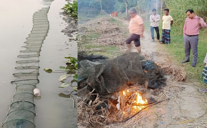 টাঙ্গাইলের মির্জাপুরে অভিযান চালিয়ে অবৈধ চায়না দোয়ারি ক্যারেন্ট জাল উদ্ধারের পর পুড়িয়ে দিয়েছেন নির্বাহী ম্যাজিষ্ট্রেট ও এসিল্যান্ড মাসুদুর রহমান। আজ সোমবার (২০ নভেম্বর) মির্জাপুর উপজেলার ফতেপুর ইউনিয়নের পারদিঘি গ্রামে অভিযান পরিচালনা করে প্রায় এক হাজার মিটার অবৈধ চায়না দোয়ারি ক্যারেন্ট পুড়িয়ে দেওয়া হয় বলে সহকারী কমিশনার (ভুমি) অফিস জানিয়েছেন।